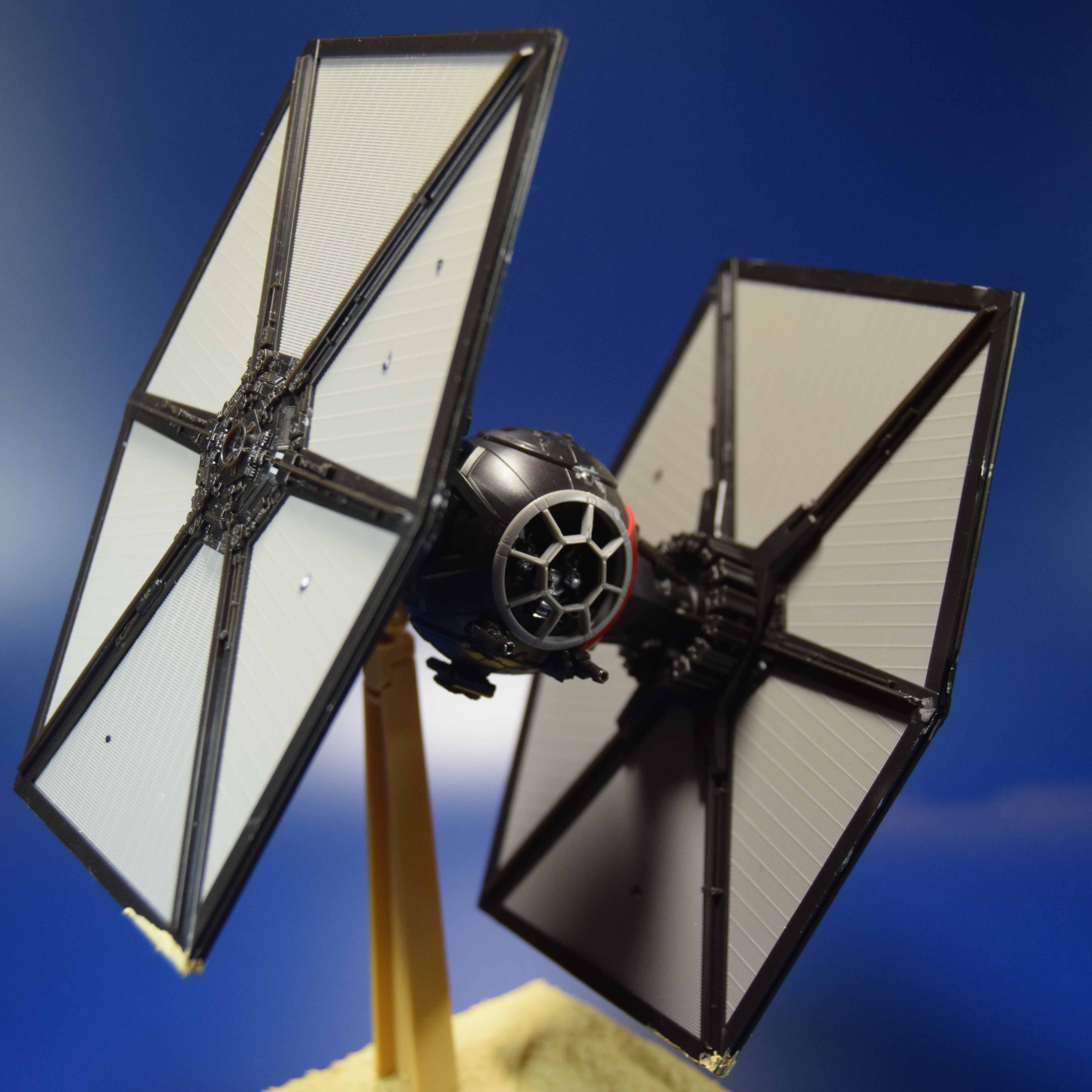 Bei diesem Modell von Bandai möchte ich mich mit dem Weathering beschäftigen. Das bedeuted die Base soll im sandlook bearbeitet werden und der Tie Fighter soll auch genutzt und leicht versandet sein.