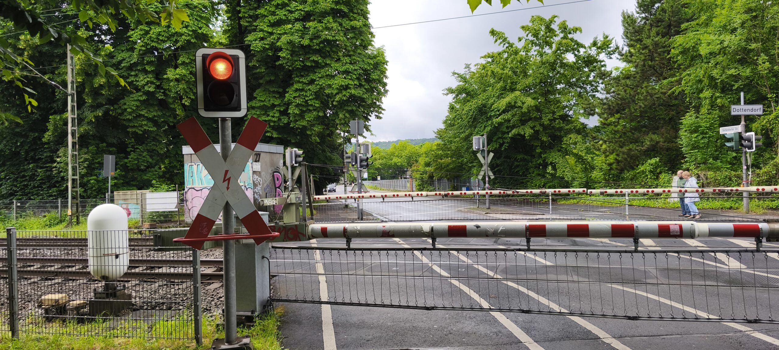 Und warum das Ganze? Nun, in direkter Nähe befindet sich ein Bahnhof, und so ist es nicht verwunderlich, dass hier reger Zugverkehr herrscht. Wenn sich die Schranke schließt, weiß der geübte Wartende: Jetzt kommen nicht nur ein, zwei, sondern oft drei Züge hintereinander durch. Einer fährt vom Bahnhof ab, einer fährt ein und einer donnert einfach nur durch. Manchmal gesellt sich auch noch ein gemächlicher Güterzug dazu, der mit gefühlten 10 km/h an dir vorbeikriecht und dir ausreichend Zeit gibt, seine Waggons zu zählen. Im Schnitt reden wir hier von guten 20 Minuten Wartezeit.