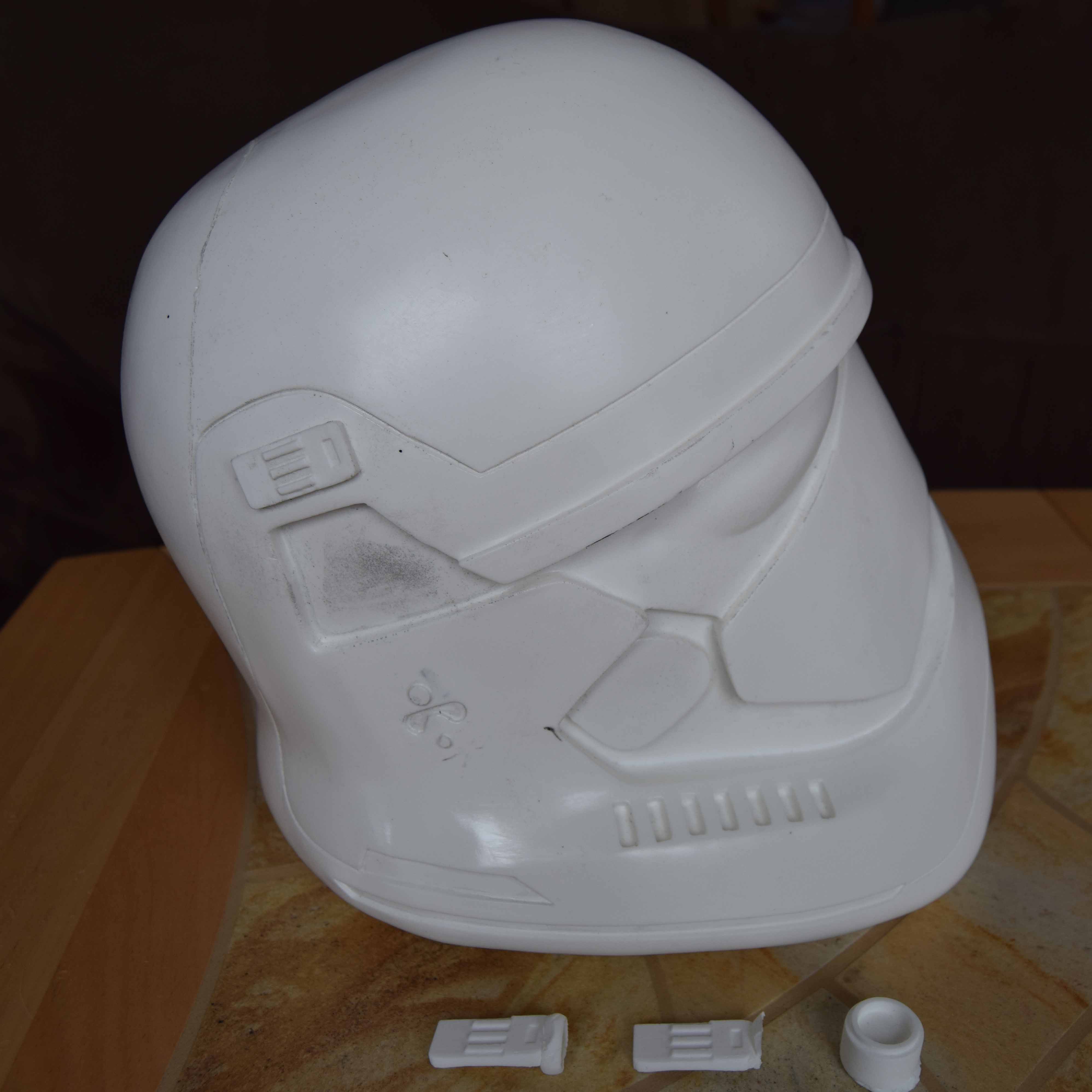Der Helm soll tragbar sein und für die Augen richtige Gläser erhalten. Für den Aktivfilter fehlen noch die Löcher und vorne Rechts soll noch eine Beleuchtung an den Autemgeräteanschluss. Als Bonus soll der Helm noch die blutigen Fingerstreifen von Fin auf dem Helm erhalten.