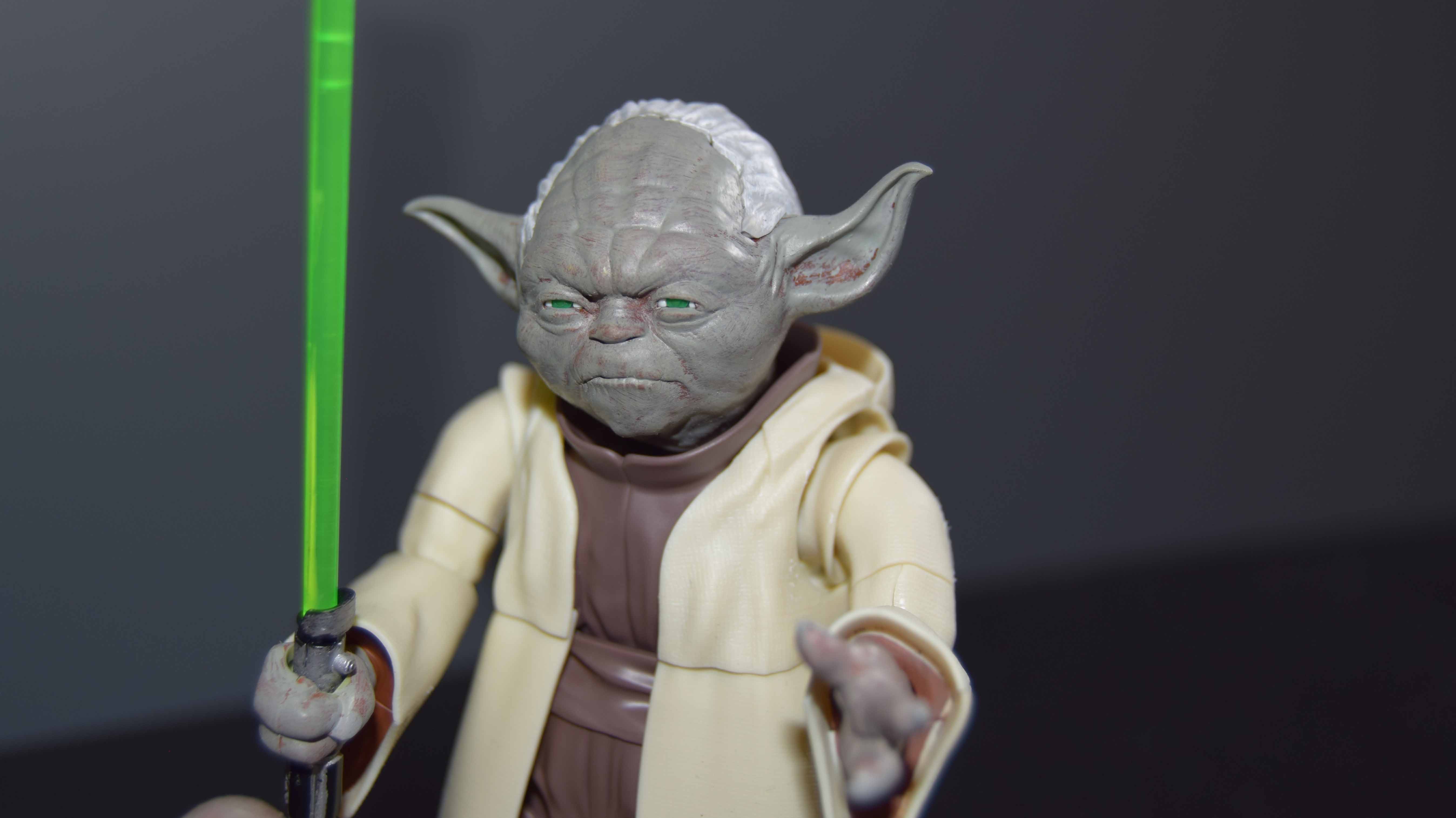 Ich habe mich entschieden nur die Haut und spezielle Elemente, wie z.B. Laserschwert, Tasche, Kette, usw., zu bemalen. Der Rest bleibt unbemalt. Da Arme und Beine beweglich sind, würde die Farbe auch nicht darauf halten. Der Umhang ist in der unteren Hälfte aus einem speziellen leicht formbaren Material, wo die Farbe nicht vernünftig hält. Die Haut habe ich braun grundiert und danach grau gebrusht. Die Fuß- und Fingernägel hab ich einen dunkleren Grauton gewählt. Der Yoda im Maßstab 1/6 gibt es mit und ohne Haare. Ich habe den Hinterkopf mit Haare gewählt. Dieser wurde weiß grundiert und grau gebrusht.