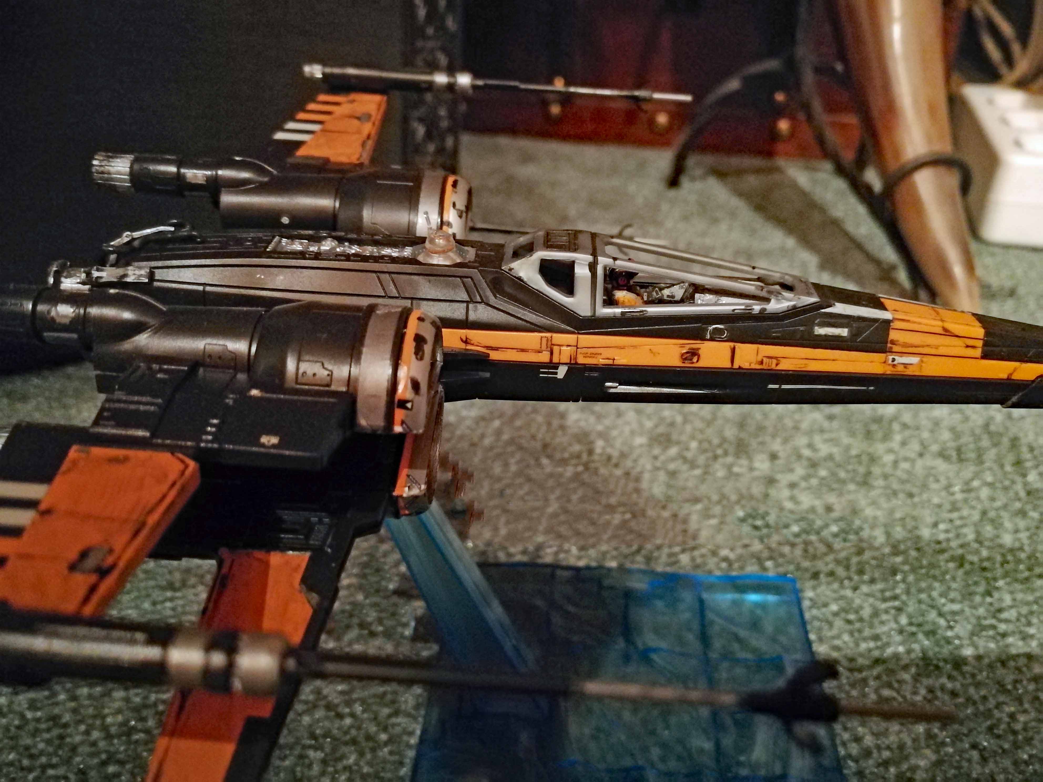 Wie bei verschiedenen anderen Bandai Raumschiff Bausätzen, kann auch hier entschieden werden ob, hier eine Kuppel / Sichtfenster für den Piloten eingesetzt werden oder nur eine offene Konstruktion. Ich habe mich fast immer für die offene Variante entschieden. Man kann dann wenigstens die Inneneinrichtung sehen, ohne das die durchsichtige Acryl Scheibe die Sicht verzerrt. Auch bei diesem Modell war die Inneneinrichtung und die Figur (Poe Dameron) sehr detailliert. Zudem ist die Kuppel abnehmbar, was einen noch besseren Blick ermöglicht. Die Figur habe ich von Hand bemalt, dafür habe ich mir die Sicht mit einer Lupe vergrößert. Die Decals mussten für die Inneneinrichtung und den Helm von Poe in der richtigen Reihenfolge aufgebracht werden. Das kam dadurch zustande das diese an den Rändern überlappten.