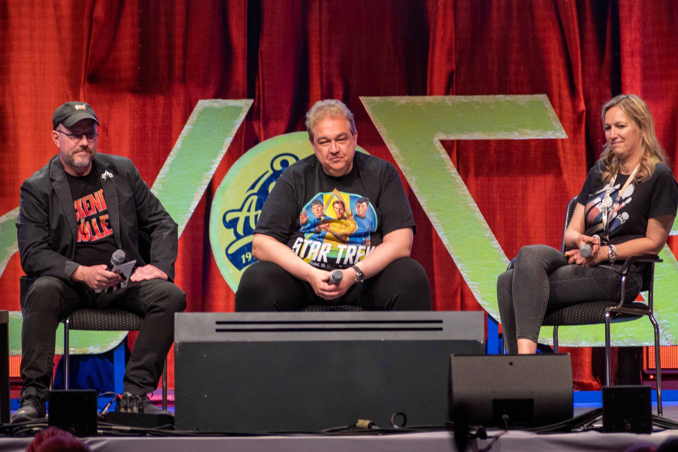 Oliver Kalkofe ist ein großer Star Trek Fan und gerade die Classic-Serie hat es ihm angetan. Damit ist er ein großer Bewunderer der Crew und dann auf William Shattner zu treffen ist ein riesiges Highlight. So wie wir auf der Fed-Con immer für ein Foto anstehen zu müssen, gilt dies auch für die bekannten Größen. Somit stand auch er eine Stunde ein für Lichtbild an, wobei man sagen muss Shattner hat es sich einfach gemacht. Er hat sich auf einen Stuhl gesetzt und man durfte sich dazu stellen. Da haben wir es auf der Fed-Con besser. 😉